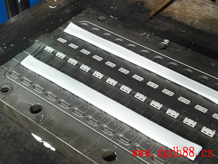 步骤2:加热模具至180°后,上下两片模具合并,胶状的硅胶小条在高温和压力下,紧贴模具内壁表面成型,100秒后成型完毕 曰韩无码打野战.