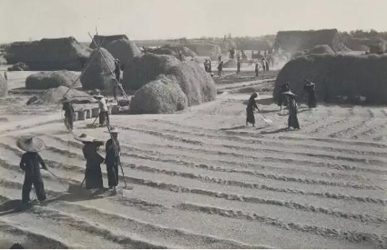 50年代,人们热闹的在一起晒稻谷。
